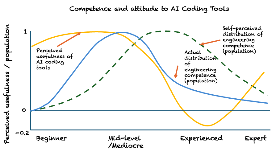 - Junior devs use AI most, senior devs save most time: Junior developers have highest adoption, but Staff+ engineers report biggest time savings (4.4 hours/week). Staff+ engineers also have the lowest adoption rates. Why aren’t senior engineers adopting as readily? Scepticism about quality? Lack of compelling use cases for complex architectural work?