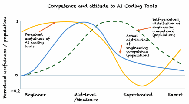 - Junior devs use AI most, senior devs save most time: Junior developers have highest adoption, but Staff+ engineers report biggest time savings (4.4 hours/week). Staff+ engineers also have the lowest adoption rates. Why aren’t senior engineers adopting as readily? Scepticism about quality? Lack of compelling use cases for complex architectural work?