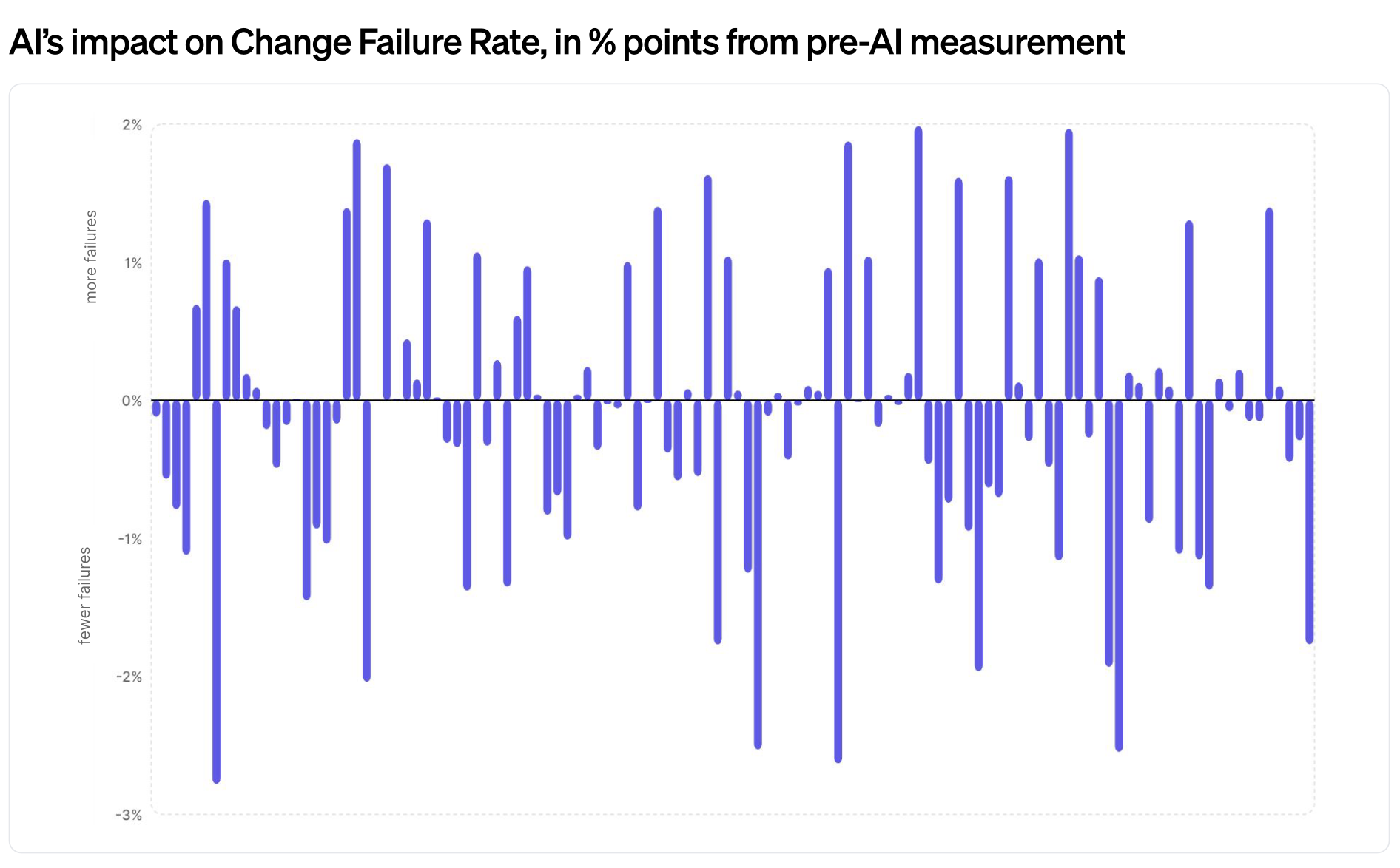 The report tracks Change Failure Rate (CFR) – the percentage of changes causing production issues. Results split sharply: some organisations see CFR improvements, others see degradation. The report calls this “varied,” but I’d argue it’s the most important signal in the entire dataset.